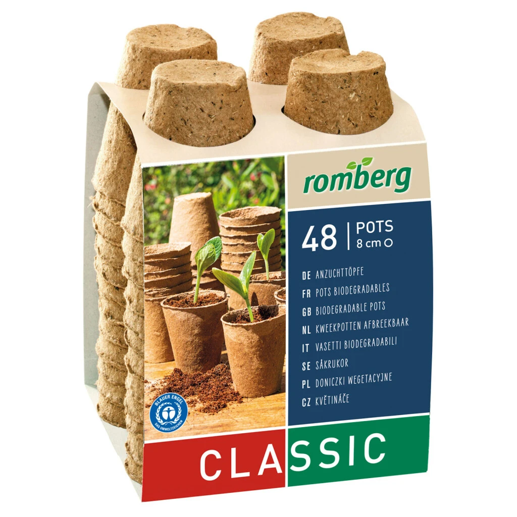 Biologisch abbaubare Anzuchttöpfe aus Zellulose und 100% torffrei mit dem Umweltsiegel ‚Der blaue Engel‘ gekennzeichnet. Für eine leichte Durchwurzelung, kein Umpflanzschock – Jungpflanzen werden mit dem Topf ausgepflanzt.