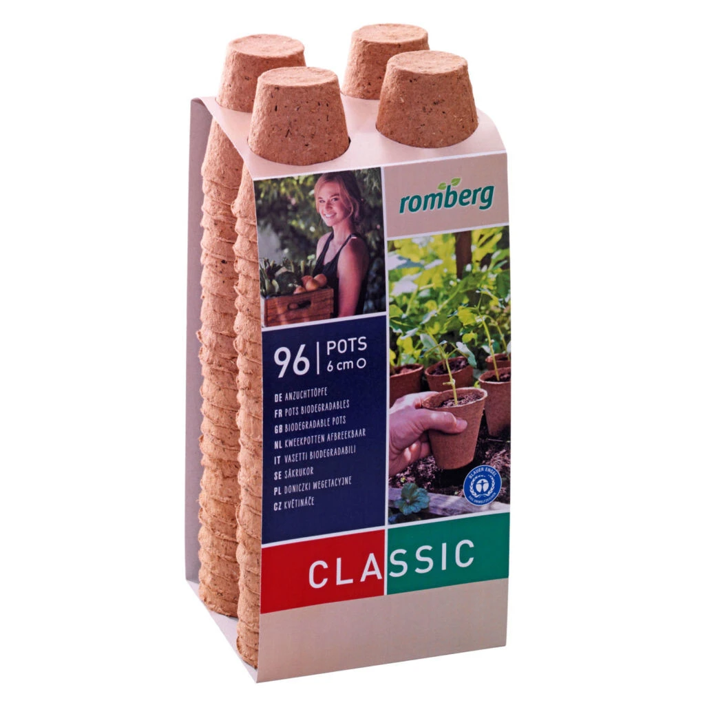 Romberg Anzuchttöpfe sind 100% torffrei und aus Zellulose hergestellt. Sie eigenen sich insbesondere für den Einsatz in Zimmergewächshäusern. Die Töpfe ermöglichen eine leichte Durchwurzelung. Es entsteht kein Umpflanzschock, da die Jungpflanzen mit dem Topf ausgepflanzt werden. Nach dem Auspflanzen zersetzt sich der Anzuchttopf biologisch.