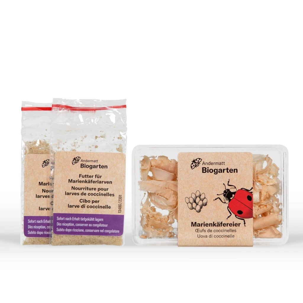 Das Nachfüll-Set beinhaltet eine Dose mit Marienkäfer-Eiern und das benötigte Futter