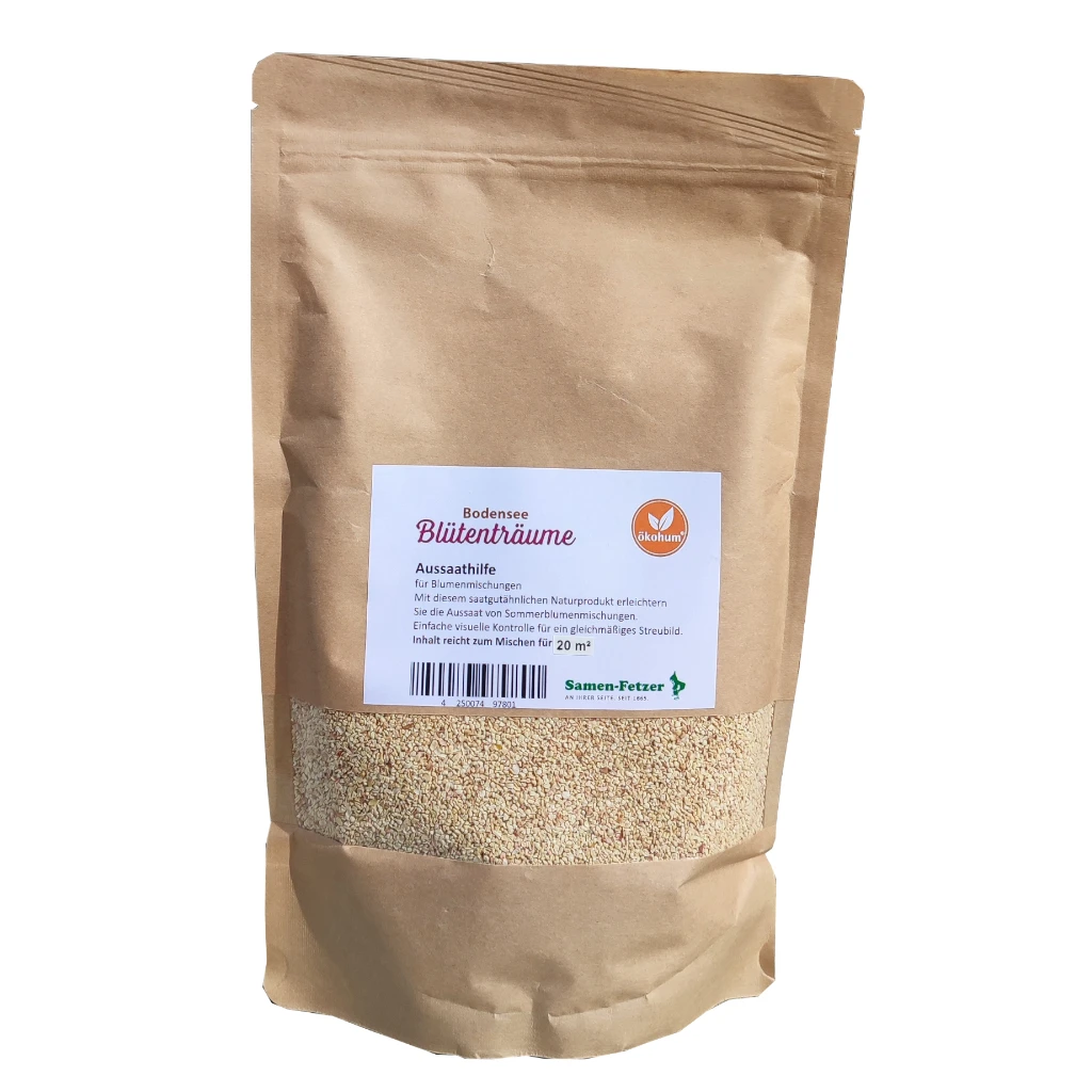 Aussaathilfen erleichtern das gleichmässige Aussäen auf einer Fläche. Dieses saatgutähnliche Naturprodukt wird mit den Samen vermischt, die Sie aussäen wollen. Hierdurch wird bei der gleichen Anzahl Samen ein grösseres Volumen geschaffen, wodurch die Dosierung und Verteilung insbesondere von kleinen Samen erleichtert wird. Die Verwendung einer Aussaathilfe ist besonders bei der Ausbringung von Blumenmischungen auf grösseren Flächen sinnvoll. Eine Aussaathilfe wird gleichzeitig mit den Samen ausgebracht.