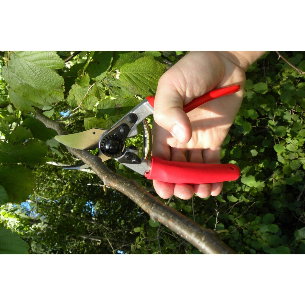 Zu den Merkmalen gehören leichte Griffe aus geschmiedetem Aluminium mit rutschsicherer Beschichtung, Klinge und Gegenklinge aus hochwertigem gehärtetem Stahl, eine Drahtschneidkerbe zum beschädigungsfreien Schneiden dünner Drähte, Saftrille für sauberes, leichtes Schneiden von klebrigem Holz und das bewährte Felco-System zur optimalen Einstellung des Schneidkopfes.