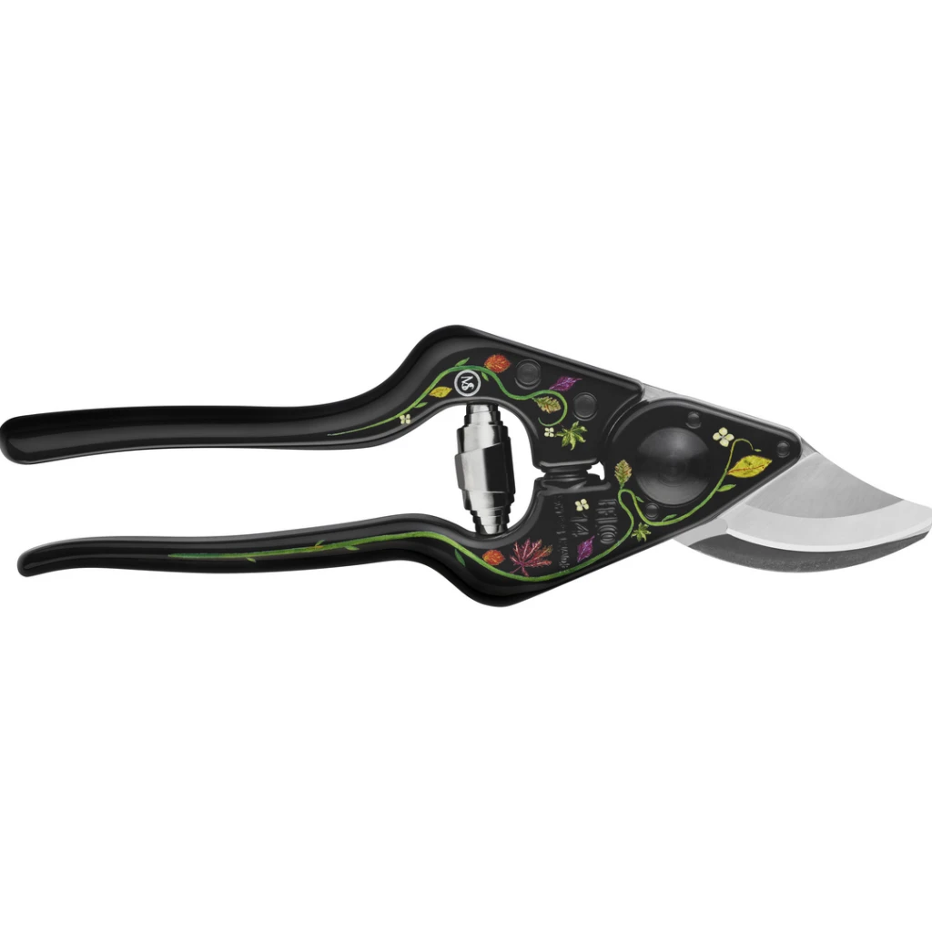 Klein, aber furchtbar effektiv! Diese kompakte Hochleistungsschere bietet eine aussergewöhnliche Handlichkeit und eine beeindruckende Schneidleistung. Die FELCO 14 verbindet eine sorgfältige Ergonomie, die sich sowohl an kleine als auch an grosse Hände anpasst, wobei der geneigte Schneidkopf und die kleinen Griffe es Ihnen ermöglichen, Ihre Schneidkraft zu optimieren. Die Aluminiumgriffe werden zunächst schwarz eloxiert, dann wird eine Arabeske, die das Herbarium von Stephane Marie darstellt, mit Hilfe der UV-Drucktechnik aufgedruckt, bevor das Ganze mit einer Thermolackierung geschützt wird.