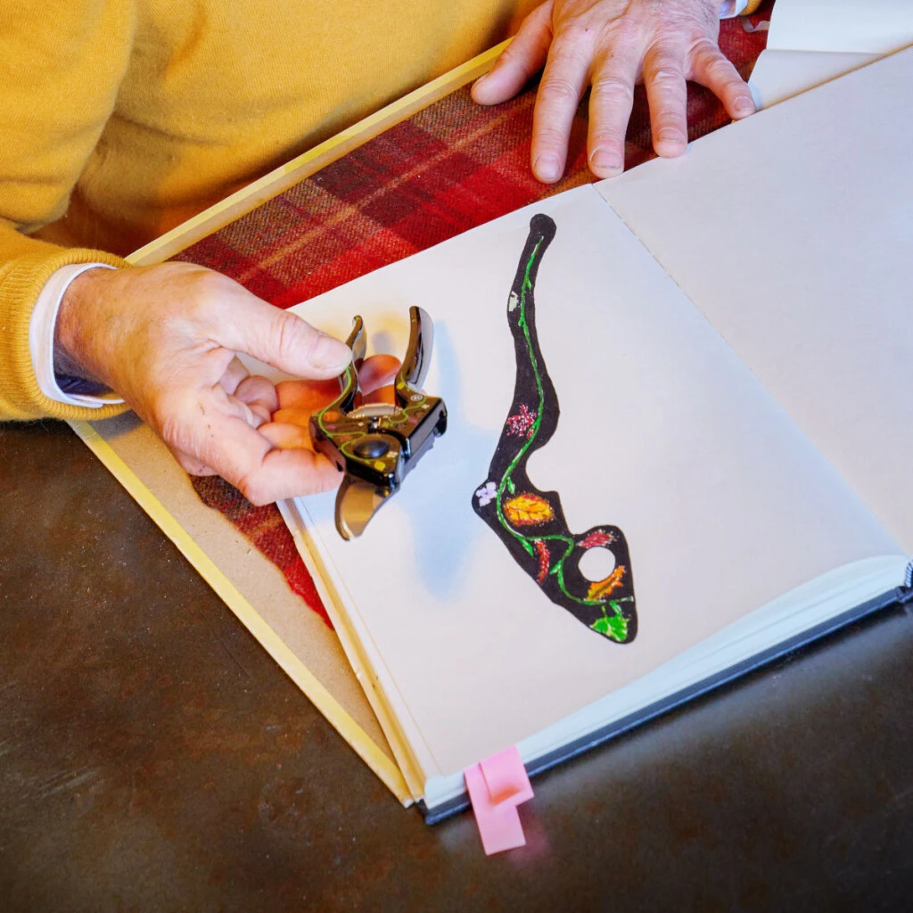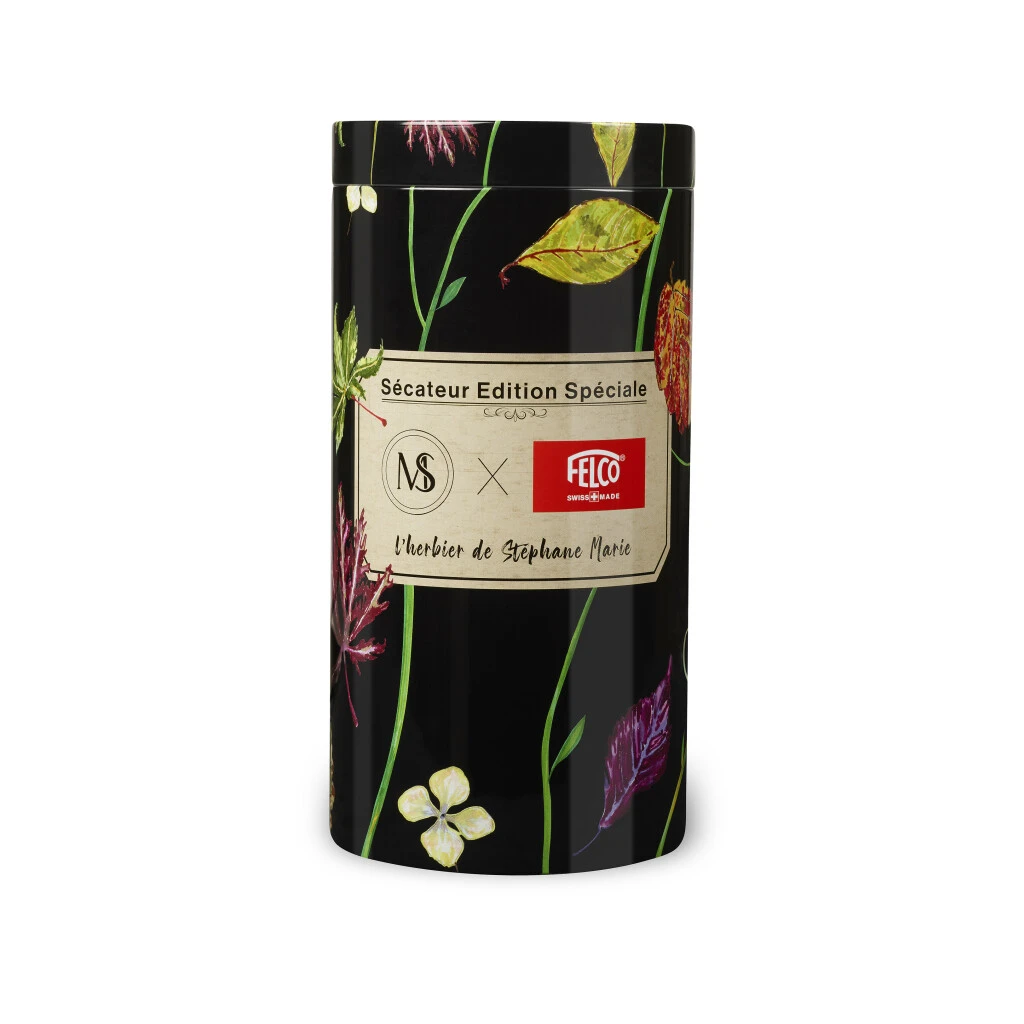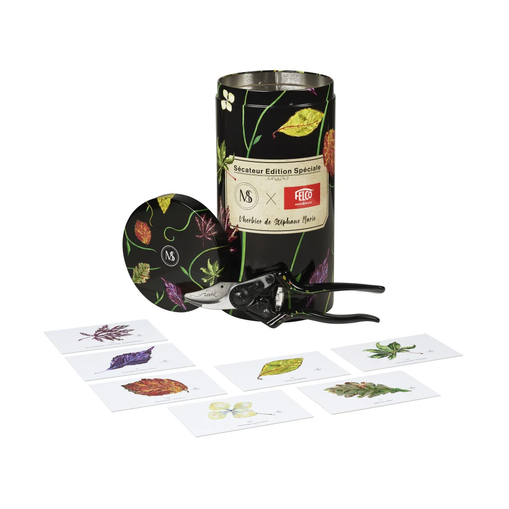 Stéphane Marie ist sehr verbunden mit seiner Heimat Normandie und dem Haus seiner Kindheit, La Maubraire. Er kultiviert mit Leidenschaft verschiedene Baumarten in seinem Garten. Als grosser Liebhaber der Herbstzeit konnte sich Stéphane Marie nicht damit abfinden, dass seine Bäume und Pflanzen ihre Blätter verlieren, so dass er jeweils die schönste und bedeutendsten behielt. Er stellte damit ein Herbarium aus seinem Garten zusammen, wobei jedes Blatt sorgfältig in seinem Zeichenbuch aufbewahrt wurde. Der talentierte Zeichner zeichnete jedes Blatt seiner Herbarium akribisch neu. Eine Präzisionsarbeit, wie sie auch die den Werkzeugen von FELCO gefordert ist, wenn Dutzende von Arbeitsschritten zur Herstellung von Gartenscheren ausgeführt werden. Auch Geduld ist gleichermassen gefragt, wie beim Zusammenbauen der Werkzeuge. Das Zusammentreffen zweier Welten, die sich in der Sonderausgabe Stephane Marie X FELCO, die in den Modellen FELCO 14, FELCO 6 und FELCO 8 erhältlich ist, perfekt vereinen.