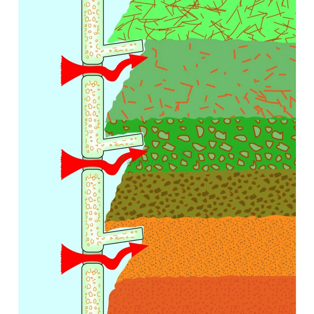 Durch die Anordnung der Belüftungsschlitze können diese nicht durch das Füllgut verschlossen werden. Um ein Austrocknen des frischen Kompostmaterials zu minimieren sind im oberen Bereich deutlich weniger offene Schlitze angeordnet.