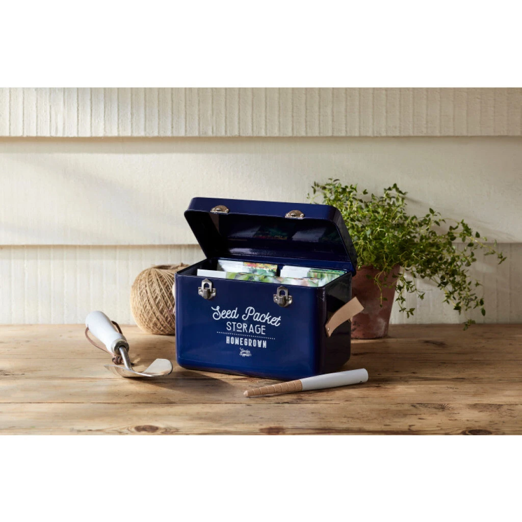 So wunderschön es auch ist, diese Aufbewahrungsdose ist auch äußerst praktisch. Zwei starke Metallverschlüsse halten den Klappdeckel sicher geschlossen, und im Inneren befinden sich drei separate Fächer, in denen Sie Ihre Gartenschätze organisieren können. Ein Fach verläuft sogar längs und gibt selbst den größten Saatgutpaketen ein Zuhause.