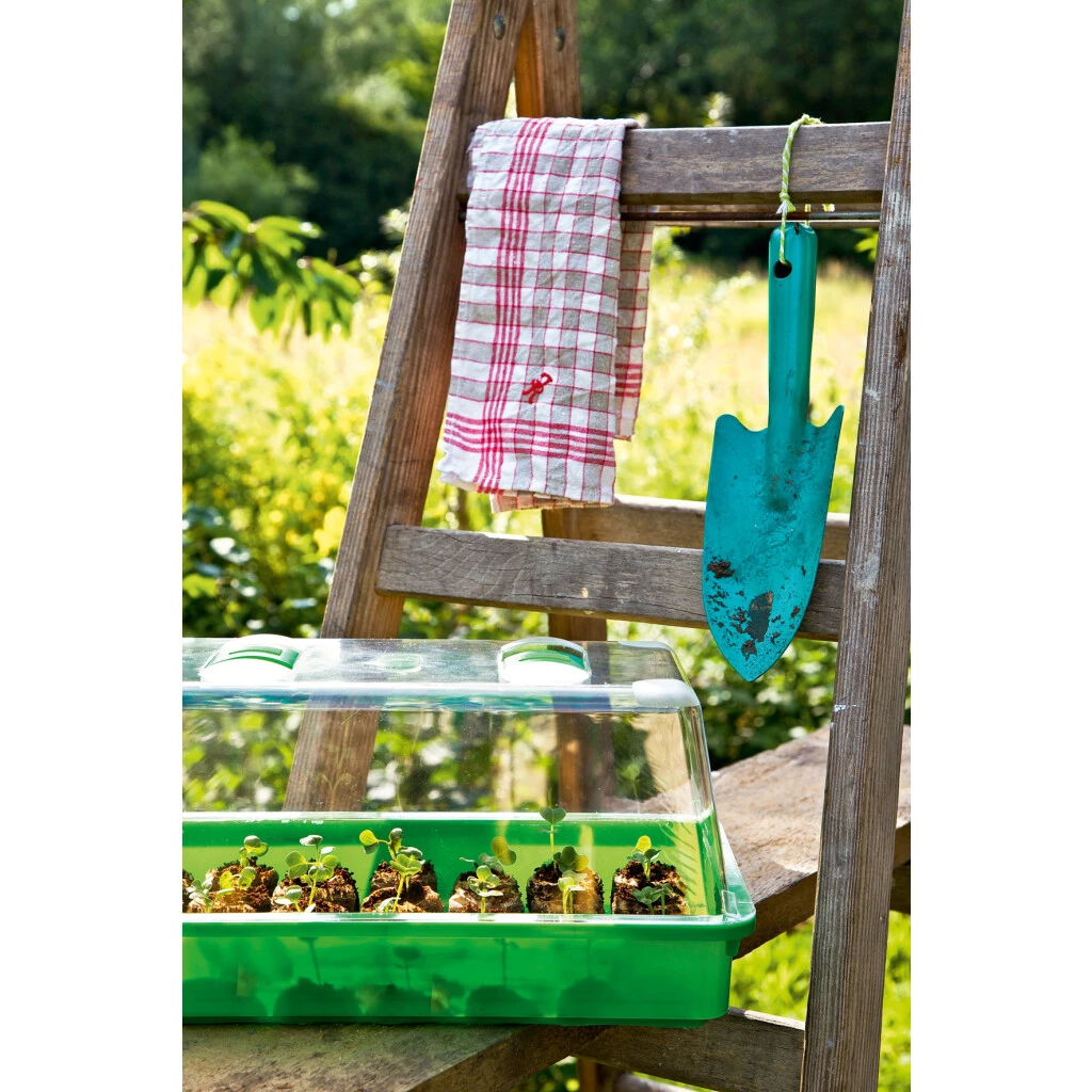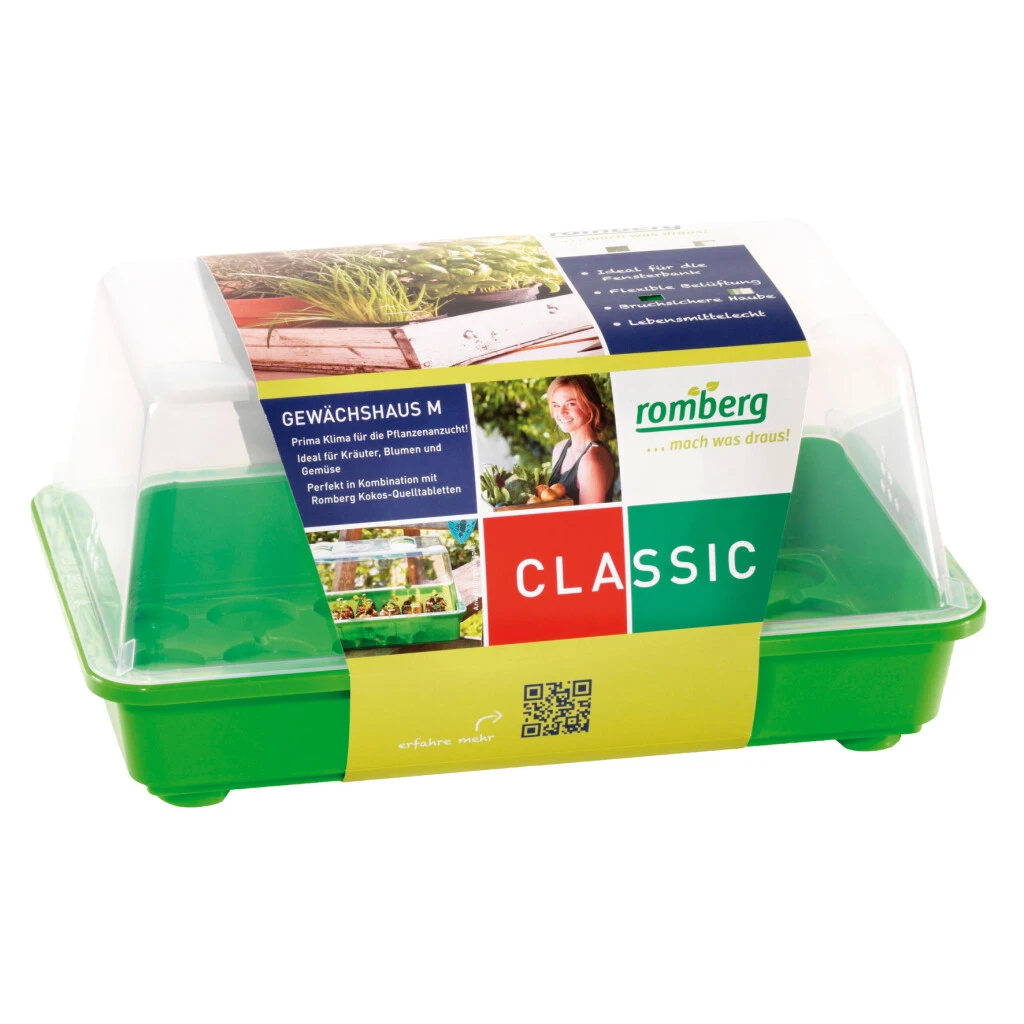Mit den Romberg Gewächshaus kann jeder Zuhause Kräuter, Blumen und Gemüse anziehen. Dieses Gewächshaus aus PAK-freiem Kunststoff ist lebensmittelecht. Die Schale hat eine Vertiefung für Quelltabletten und Rinnen zur optimalen Wasserverteilung und ein Ventilationssystem mit Belüftungslöchern und Schiebereglern in der Haube. Es entstehen ausserdem keine Tropfen, da Kondenswasser vom Deckel in die Schale zurückläuft. Das Gewächshaus hat ein kompaktes Format und ist besonders leicht zu handhaben. Perfekt in Kombination mit Romberg Kokos-Quelltabletten.