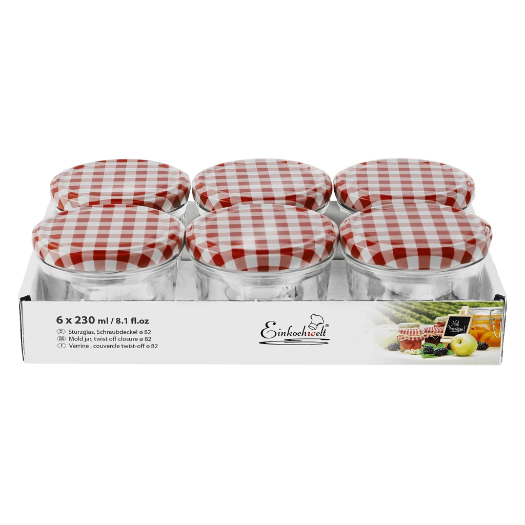 Transparentes Glas mit karriertem Drehverschluss in rot/weiss, mit Labeletikette «Einkochwelt».