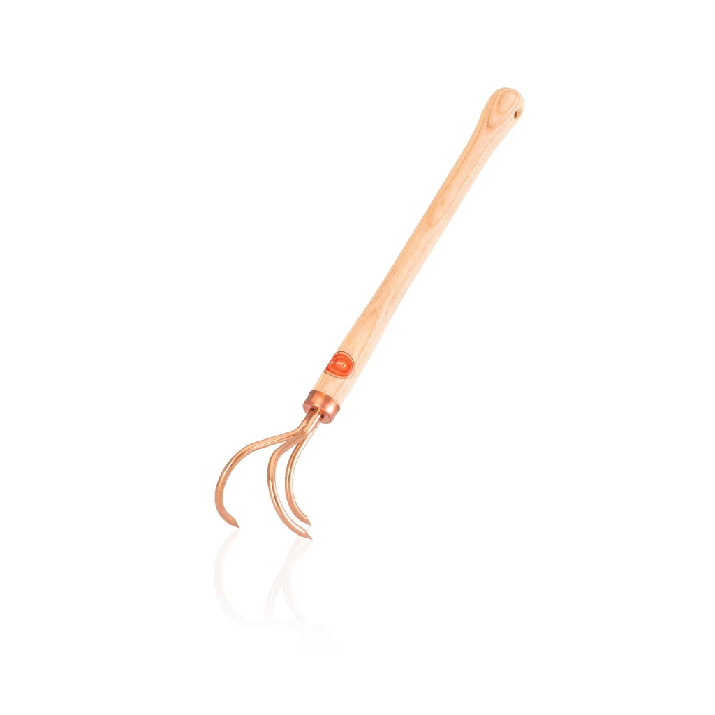 Bronzeklaue zum Lösen und Jäten. Ideale Neigung für komfortables Arbeiten. Kupferspuren ionisieren Wasser im Boden und erhöhen so dessen Oberflächenspannung. Dies reduziert die Auswirkungen von Trockenheit und erleichtert den Pflanzen das Pumpen von Wasser.