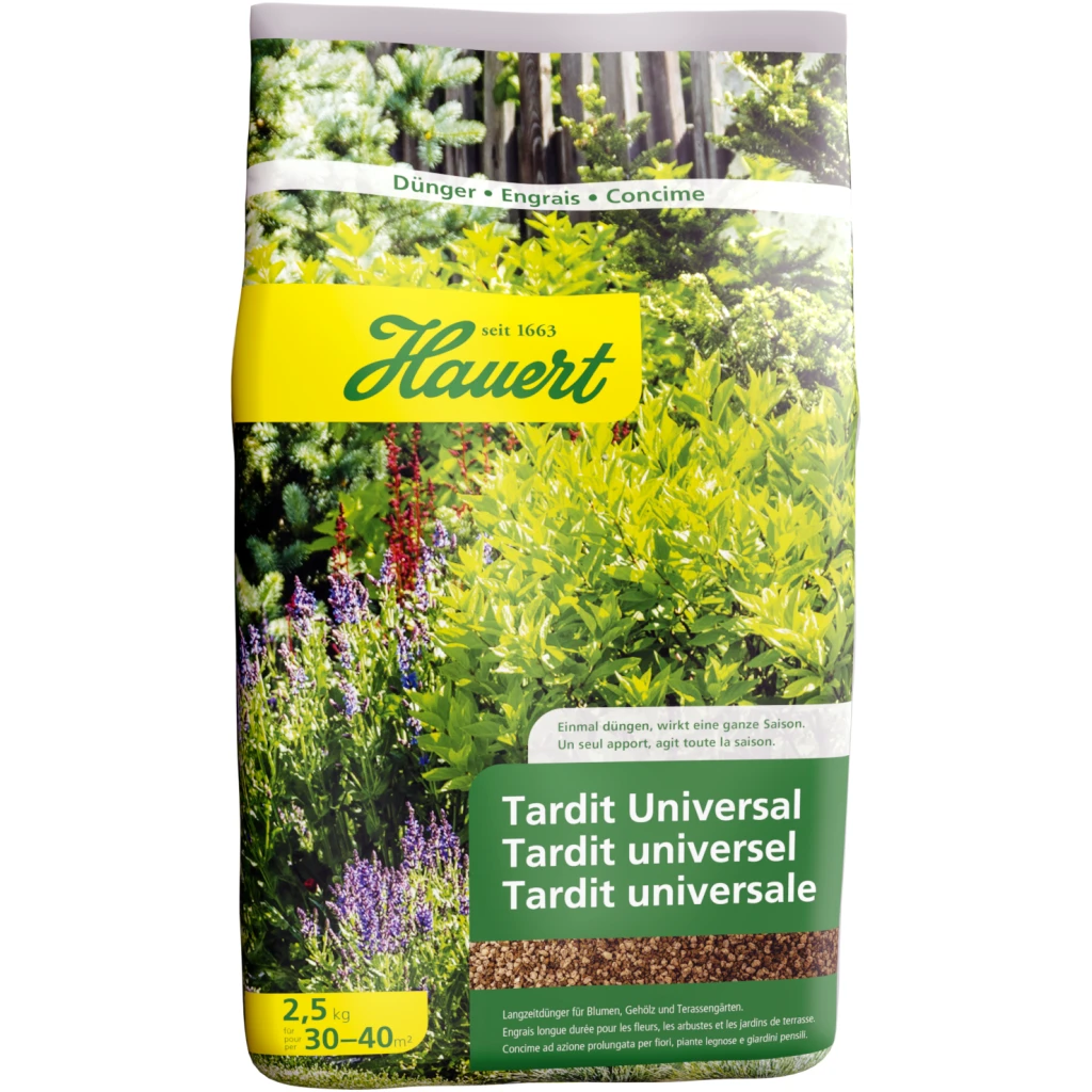 Tardit von Hauert eignet sich besonders für Blumenrabatten, Stauden, Sträucher, Nadelgehölze und Dachgärten. Die Umhüllung gibt die ausgewogenen Nährstoffe kontrolliert und bedarfsgerecht frei. Eine Gabe Tardit versorgt die Pflanzen für eine ganze Saison.