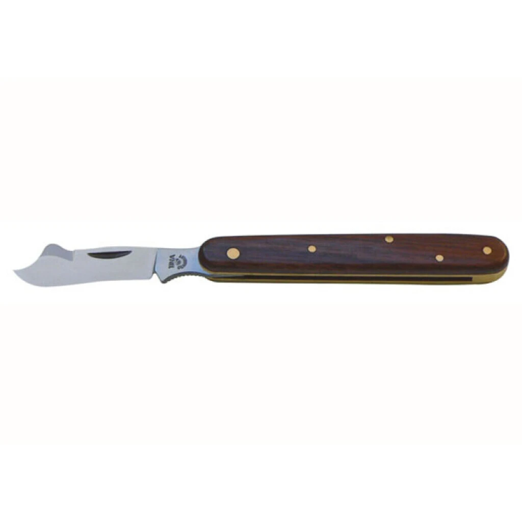 Okuliermesser mit dem bewährten TINA-Handgriff: Dieses Gartenmesser liegt wie gegossen in der Hand, vermeidet Blasenbildung an den Händen und gibt dem den Schneidedruck ausübenden Zeigefinger eine breite, wohltuende Auflage. Dadurch, dass die Klinge bis an die Schneide im Heft steckt, ist ein besonders guter Sitz gewährleistet. Die Verbreiterung des Heftes nahe der Schneide schützt gegen ein Abgleiten in die Schneide. Der Griff besteht aus polierter Nussbaumschalen. Die Schneide ist einseitig.