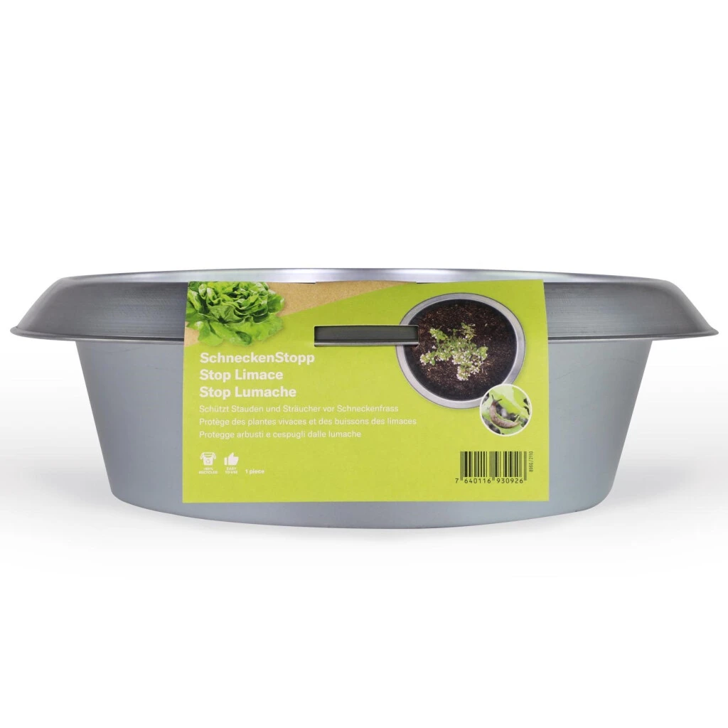 SchneckenStopp mit dem nach unten gekrümmten Rand hält die Schnecken von den Pflanzen fern und wird bei Aussaaten und Setzlingen sowie bei frisch austreibenden Stauden eingesetzt.