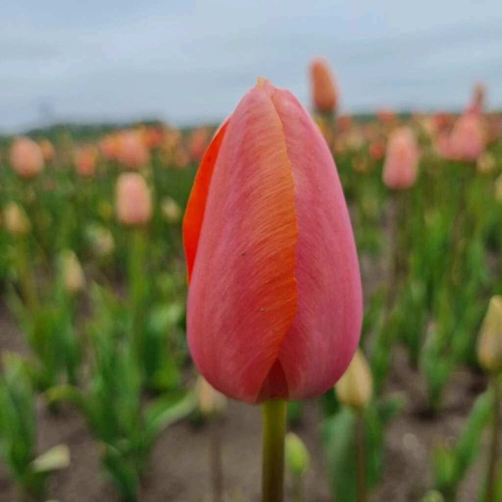 Die Tulpe ‚Menton‘ hat eine wundervolle, hellorangene Farbe, die sich zu einem hübschen rosa weiterentwickelt.