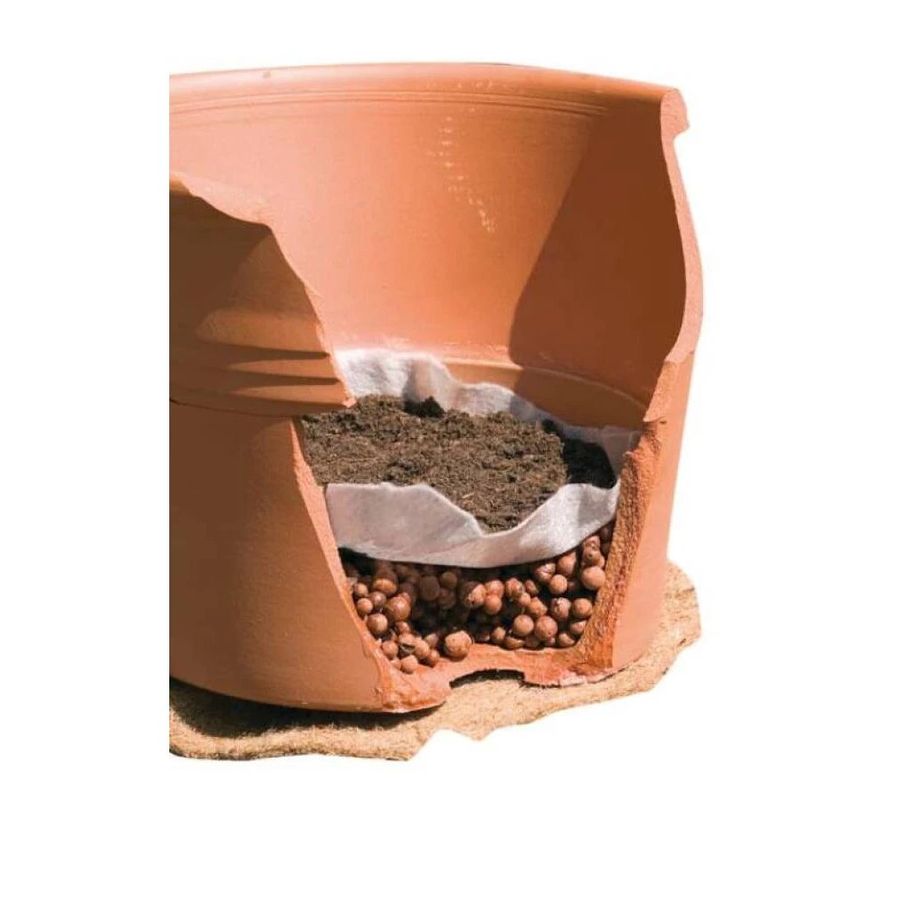 Dank dem Trennvlies wird der Blähton von der Erde getrennt, dies verhindert das Ausschwemmen der Erde in Gefässen und die Wurzeln befinden sich weniger im stehenden Wasser.