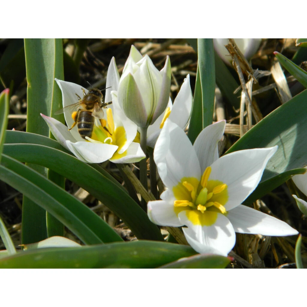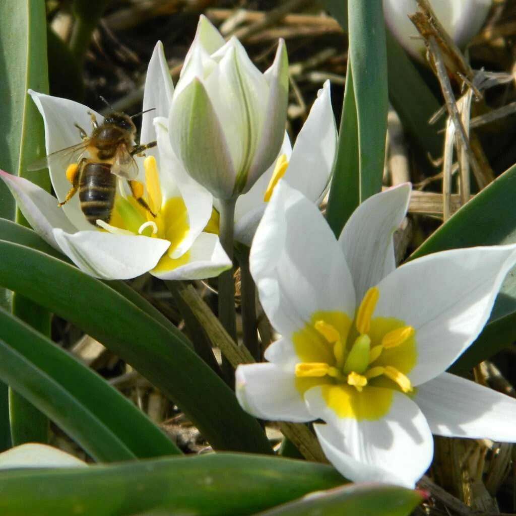 Diese Wildtulpe mit einfachen, weissen Blüten mit gelber Mitte wird gerne von Bienen besucht und ist gut zum Verwildern geeignet.