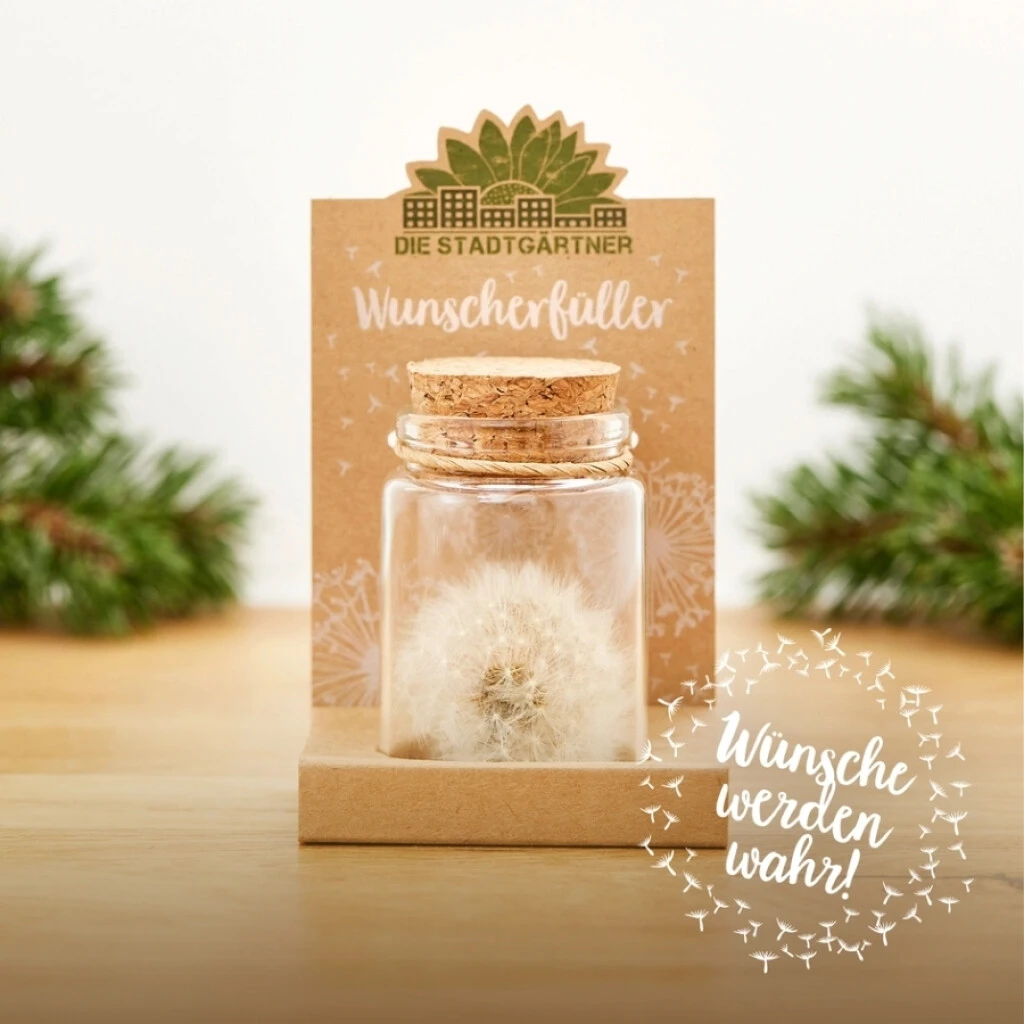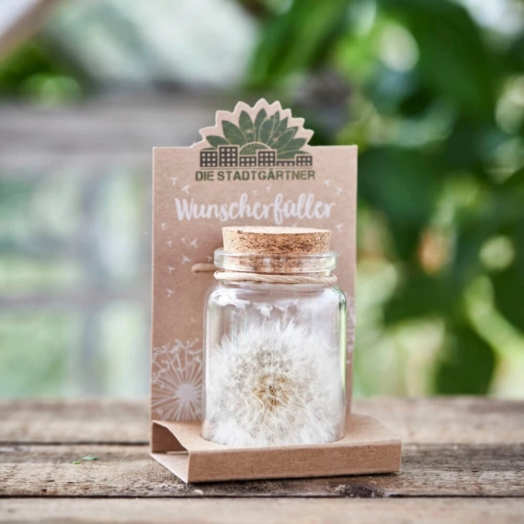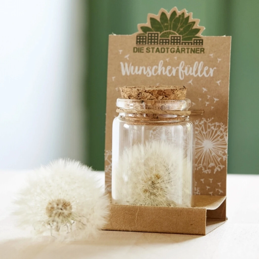 Der Wunscherfüller ist das ideale Geschenk für jede Gelegenheit, bei der Sie einem besonderen Menschen die besten Wünsche übermitteln möchten. Ob Geburtstag, Hochzeit, Weihnachten, Valentinstag oder einfach als liebevolle Überraschung zwischendurch, mit der handgepflückten Pusteblume im Glas treffen Sie direkt ins Herz. Die Pusteblume weckt Erinnerungen an die sorgenfreie Kindheit und belebt den Glauben an Magie.